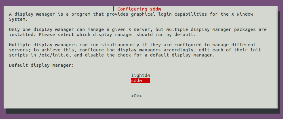 Note that you can always change the display manager later with sudo dpkg-reconfigure sddm command.
