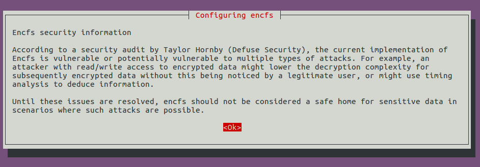 During the installation, a prompt tells you that the current implementation of encfs is vulnerable and should not be used. Press Enter to continue.