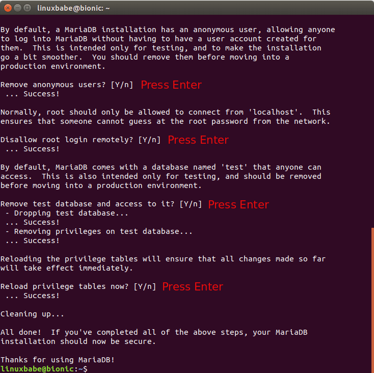 Next, you can press Enter to answer all remaining questions, which will remove anonymous user, disable remote root login and remove test database. This step is a basic requirement for MariaDB database security. (Notice that Y is capitalized, which means it is the default answer. )