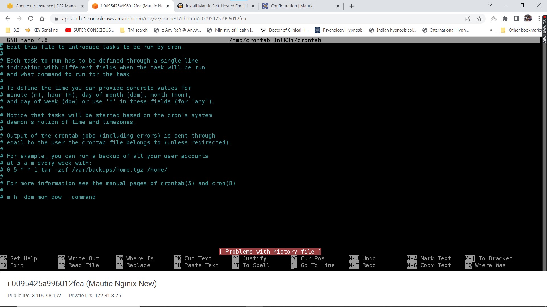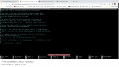 1) When I try to add a cron job with this command “sudo -u www-data crontab -e” , I found “Problem with history file” (attached screenshot). What will be the impact of this problem? And how can I remove this problem? Please guide me with step by step process.