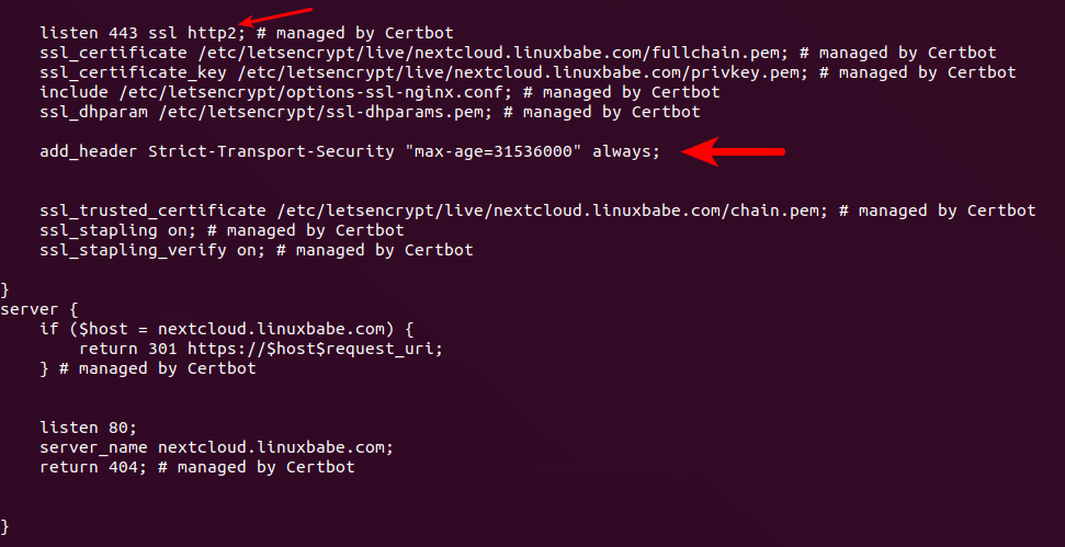 Put the following text into the file. Replace nextcloud.example.com with your own preferred sub-domain. Don’t forget to create DNS A record for this sub-domain in your DNS zone editor. If you don’t have a real domain name, I recommend going to NameCheap to buy one. The price is low and they give whois privacy protection free for life.