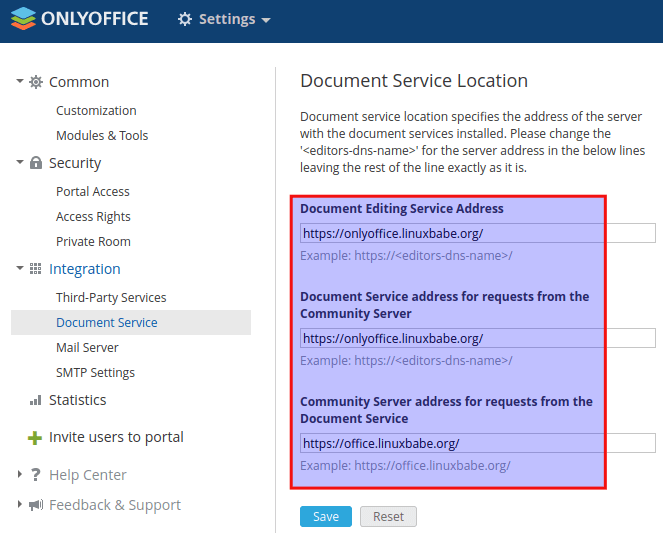 • Community Server address for requests from the Document service: https://office.your-domain.com