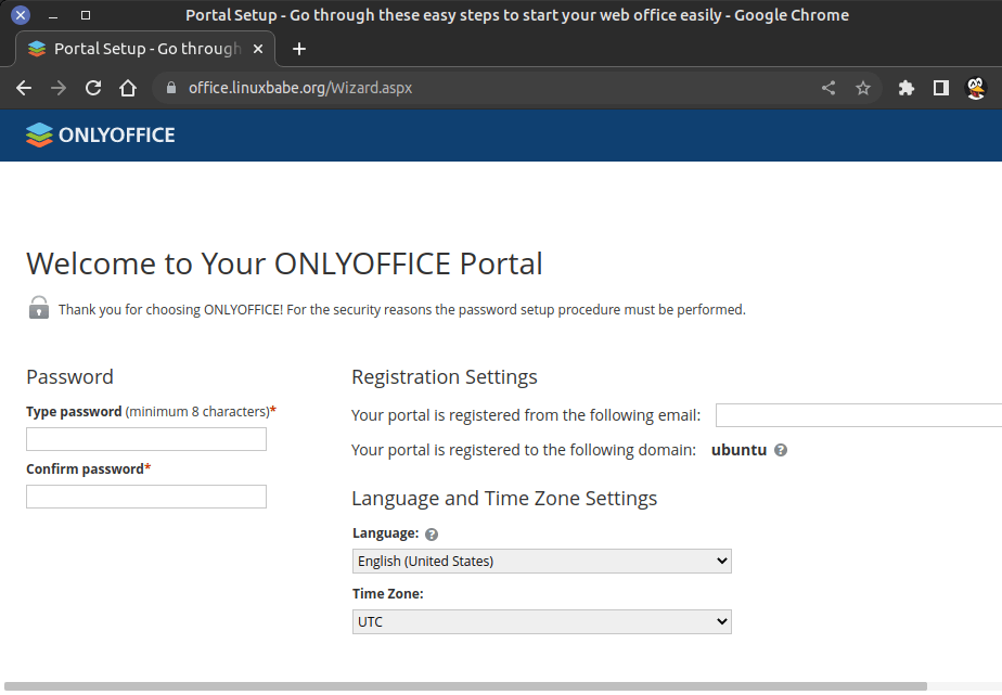 Visit https://office.your-domain.com in web browser to launch the OnlyOffice portal setup wizard. All you need to do is enter your email address and set a password for the admin account. Then you will be able to log in.
