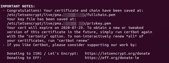 You will be asked if you want to receive emails from EFF(Electronic Frontier Foundation). After choosing Y or N, your TLS certificate will be automatically obtained and configured for you, which is indicated by the message below.