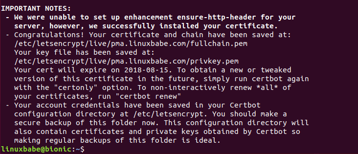 You will be asked if you want to receive emails from EFF(Electronic Frontier Foundation). After choosing Y or N, your TLS certificate will be automatically obtained and configured for you, which is indicated by the message below.