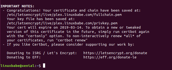 sudo certbot --nginx --agree-tos --redirect --hsts --staple-ocsp --email [email protected] -d plex.example.com