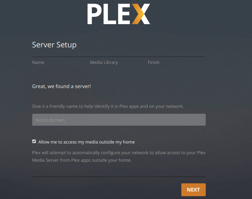 On the next screen, enter a name for your Plex server. Make sure Allow me to access my media outside my home is ticked on. Then click Next.
