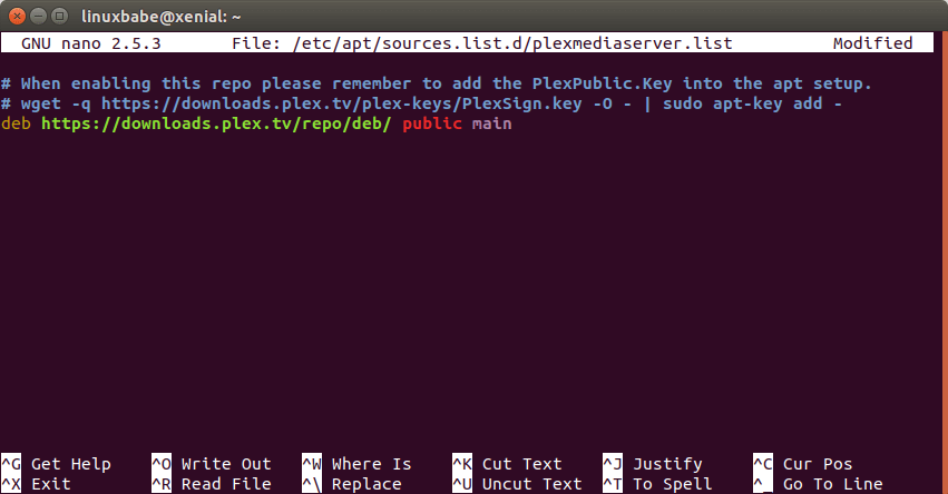 Then save and close the file. To save a file in Nano text editor, press Ctrl+O, the press Enter to confirm. To exit, press Ctrl+X. After that, run the following command to import Plex public key to apt package manager.