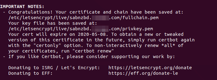 sudo certbot --nginx --agree-tos --redirect --hsts --staple-ocsp --email [email protected] -d sabnzbd.your-domain.com