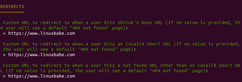 Then configure redirects for anomaly cases. When visitors hit my Shlink’s base URL (https://lnux.be), they will be redirected to my website. You can also create a custom URL for 404 not found page.