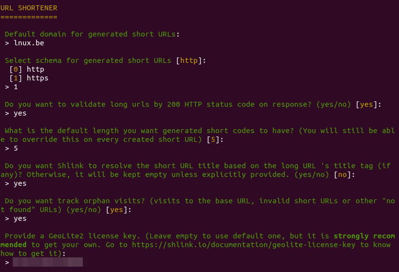 Next, enter the default domain for your URL shortener and select the scheme type (https). Then answer several simple questions.