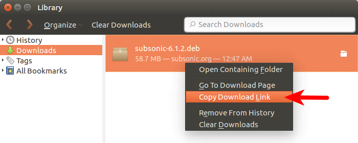 It is very easy to upgrade existing Subsonic server to the latest version. First go to Subsonic download page and download the latest Debian/Ubuntu package (6.1.2 in this example). You can get the download link in Firefox download manager as shown in the screenshot below.
