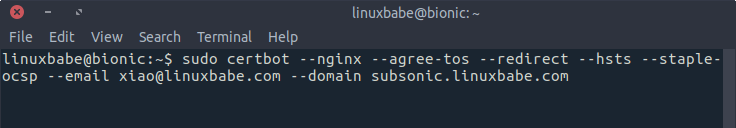 sudo certbot --nginx --agree-tos --redirect --hsts --staple-ocsp --email your-email-address --domain subsonic.your-domain.com