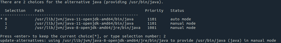 Type a number to select Java 8 as the default version.