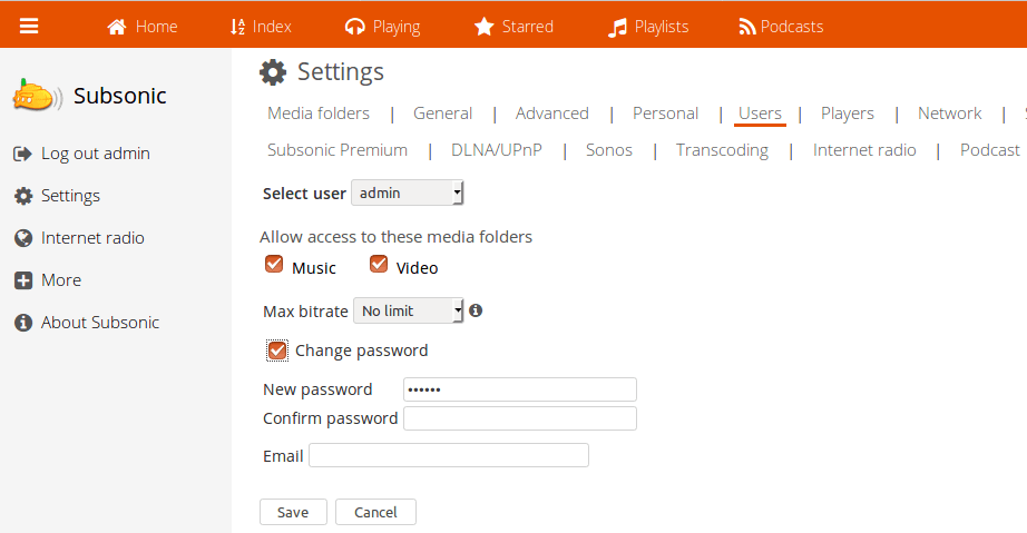 Also add media folders in the settings page and click the save button. Note that the folder must be accessible to the user Subsonic is running as. After folder is added, click “Scan media folder now” button and you will be able to listen to music in the Index page.