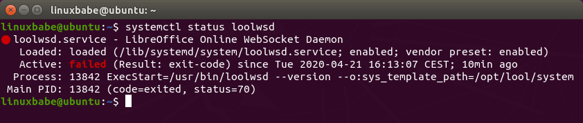 Apr 21 16:13:06 ubuntu coolwsd[13842]: File not found: /etc/coolwsd/ca-chain.cert.pem Apr 21 16:13:06 ubuntu systemd[1]: coolwsd.service: Main process exited, code=exited, status Apr 21 16:13:06 ubuntu systemd[1]: coolwsd.service: Failed with result 'exit-code'. Apr 21 16:13:07 ubuntu systemd[1]: coolwsd.service: Service hold-off time over, scheduling r Apr 21 16:13:07 ubuntu systemd[1]: coolwsd.service: Scheduled restart job, restart counter i Apr 21 16:13:07 ubuntu systemd[1]: Stopped LibreOffice Online WebSocket Daemon. Apr 21 16:13:07 ubuntu systemd[1]: coolwsd.service: Start request repeated too quickly. Apr 21 16:13:07 ubuntu systemd[1]: coolwsd.service: Failed with result 'exit-code'. Apr 21 16:13:07 ubuntu systemd[1]: Failed to start LibreOffice Online WebSocket Daemon.