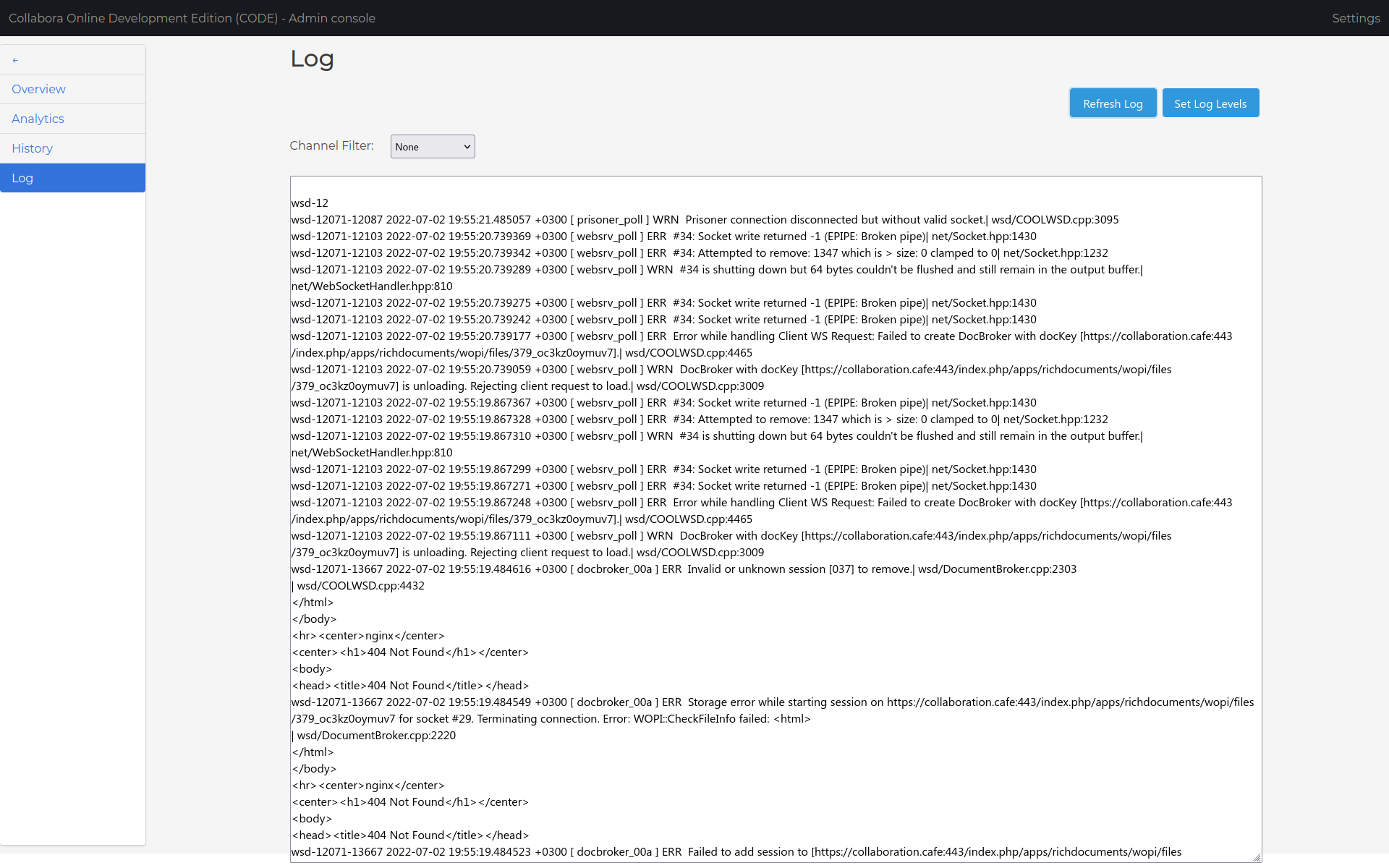 The Collabora Online admin panel is reachable as well. I enabled coolwsd logging into /var/log/coolwsd.log but the log contains no apparent error messages.