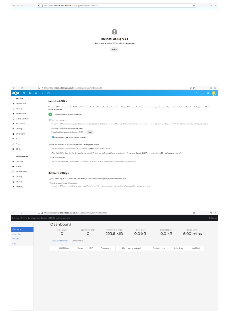 So everything *looks* good, but when I try to open a document, loading fails. When I look at the logs in the Collabora Online admin panel, I have the output below (see the attached screenshot).