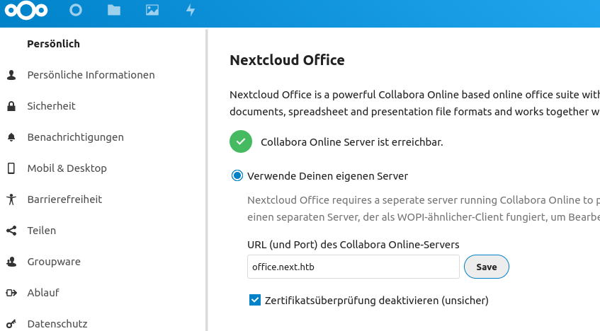 In the Nextcloud Settings/Administration/Nextcloud Office tab, Nextcloud seems to see my Collabora Online server just fine (it’s installed on a subdomain of the domain hosting my Nextcloud.