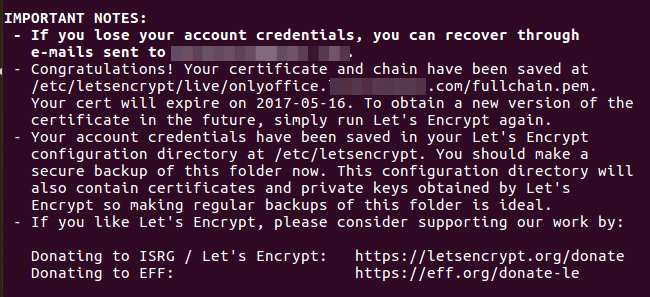 sudo letsencrypt certonly --webroot --agree-tos --email your-email-address -d onlyoffice.your-domain.com -w /var/www/onlyoffice/