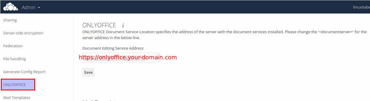 After that, go to ownCloud admin page, select ONLYOFFICE tab on the left pane and enter your domain name in Document Editing Service Address field.