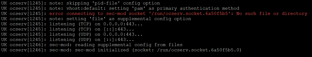 If you look carefully at the log, it said it can’t find the socket, and next, it initialized this socket (/run/ocserv.socket.6a50f5b5). So ocserv solved the problem by itself, right? 🙂