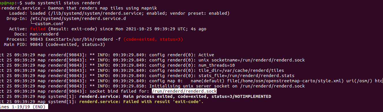 Jan 08 19:31:36 tileme renderd[912]: socket bind failed for: /run/renderd/renderd.sock