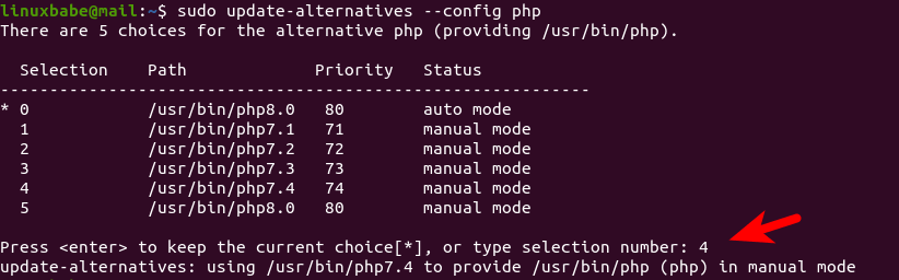 If you install a newer version of PHP on Ubuntu, then it will become the default version for the command line. I installed PHP8.0, but I still want PHP7.4 as the default version for the command line.