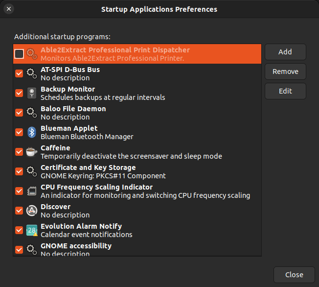 - Backup monitor: This is deja-dup-monitor. If you don’t use Deja-dup to back up files, disable it. Personally, I use Duplicati to back up my files.