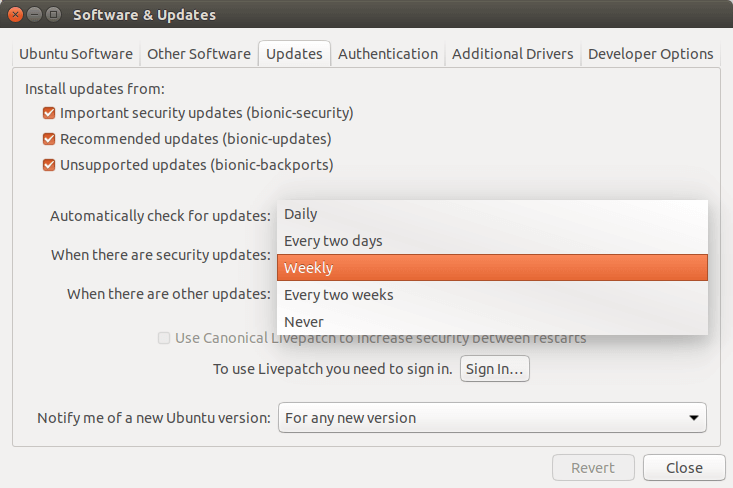 If you are a person who often update packages manually, I would recommend setting the “automatically check for updates” to weekly instead of daily. To really fix the error message once and for all, set the value to Never.