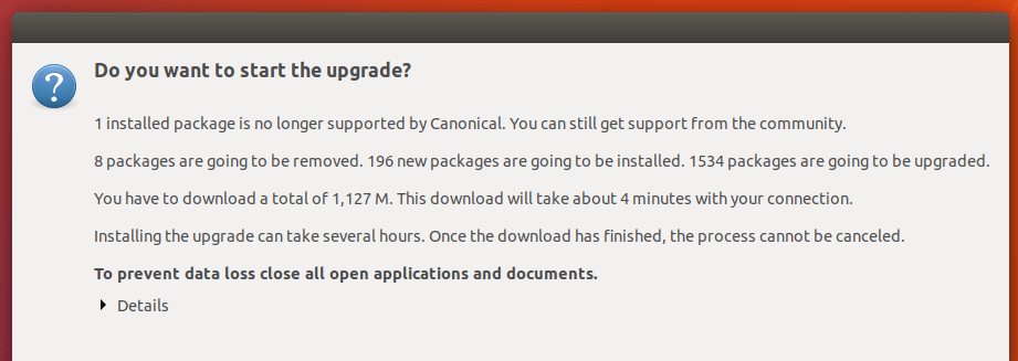 During this process, you might be told some packages are no longer supported by Canonical and some packages will be removed. You can click details to see what packages is going to be removed. Once you are ready, click the Start Upgrade button.
