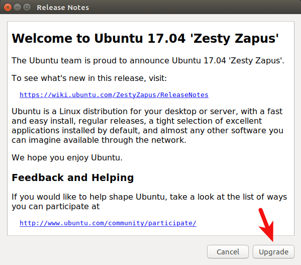 Then enter your password. The Ubuntu 17.04 release notes window will appear. Click Upgrade.