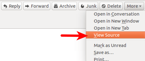 In Mozilla Thunderbird, open the the email sent by WordPress. On the upper-right corner, click More button, and select View Source from the drop-down menu.